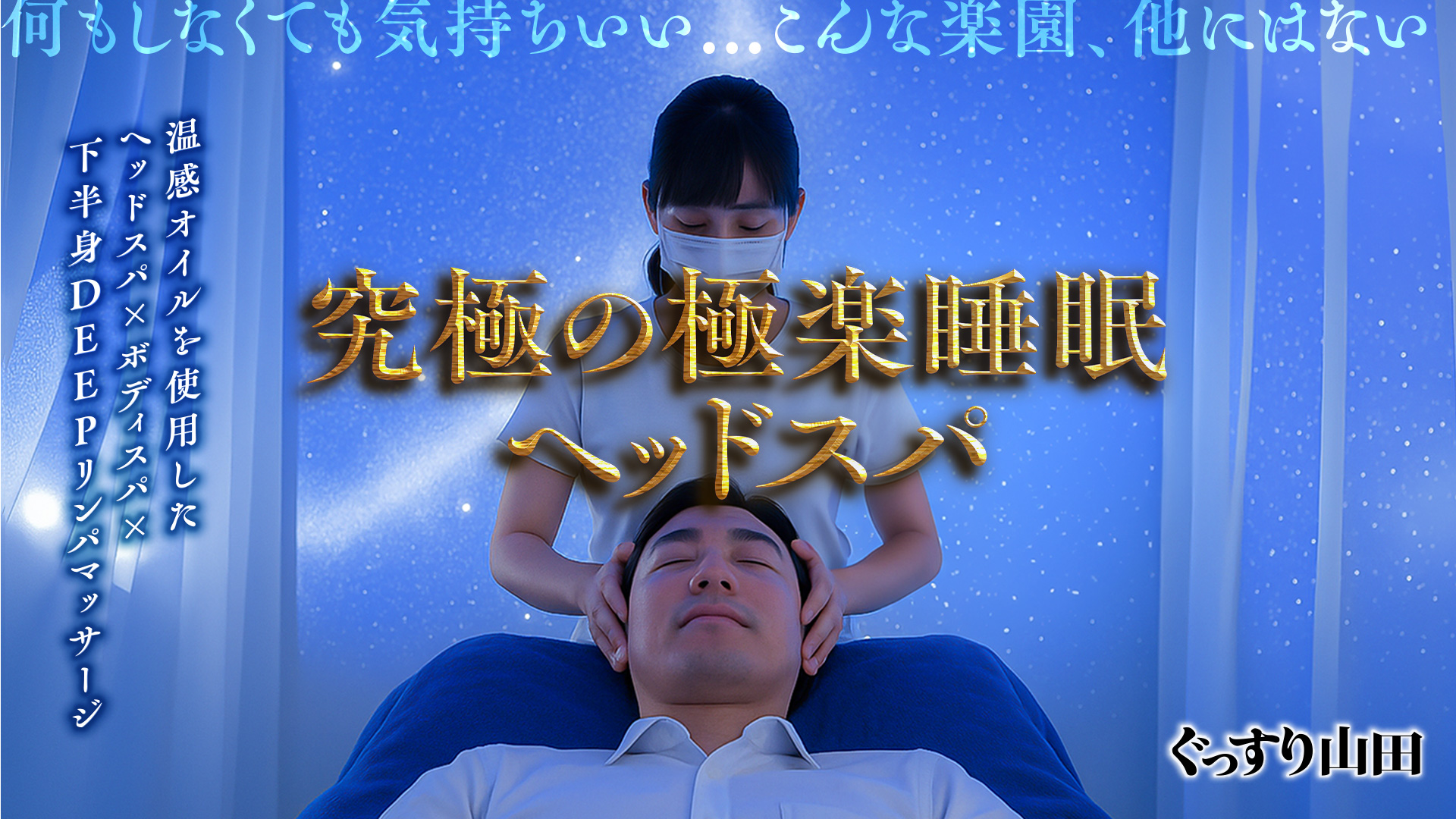 静かにゆったりとイチャイチャもしたくて、我慢出来ずに“2度目まして”をお願いしました。 先ずは、背中の張りが強かったようで、丁寧にほぐしてもらいましたが、強弱の加減が程よく、ゆっくりとした空気に身を委ねさせてくれます。 脚から足裏のマッサージに移った頃には、次第にまぶたが重くなるような心地よさに包まれます。 一通りマッサージが終わると、耳元への囁きとキス。 もうたまりません。 素肌の温もりが重なるソフトタッチとオールヌードで気分も徐々に高まります。 丁寧で巧みな手コキとキスに、満たされた気持ちが壁まで飛んで行きました。 まだまだ元気な自分を取り戻した、夢のようなひと時でした。