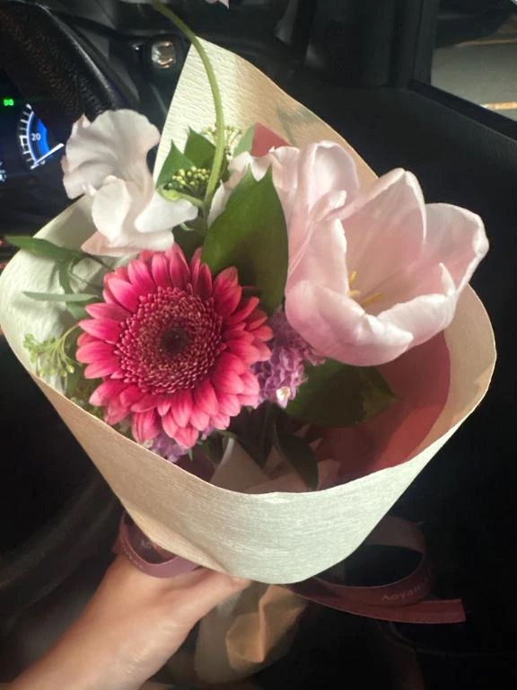 お花とケーキを持って待機中です🚗💕