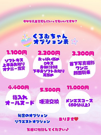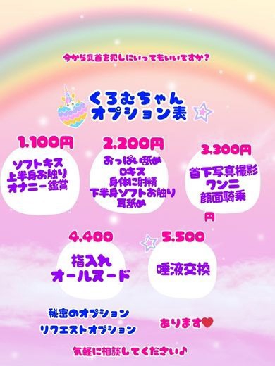 くろむちゃんオプション 1,100円 ソフトキス 上半身お触り オナニー鑑賞 2,200円 おっぱい舐め Dキス 身体に射精 下半身ソフトお触り (オールヌードなしの場合は服の上から) 耳舐め 3,300円 首下写真撮影(1枚) クンニ 顔面騎乗 4,400円 指入れ オールヌード 5,500円 唾液交換 秘密のオプション あります♡ 会った時に教えるね ↓リクエストオプション↓ 対応できます♥