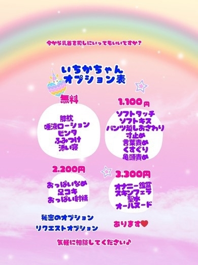 いちかちゃんオプション♡ ♡無料♡ 膝枕 唾液ローション ビンタ ふみつけ 添い寝 1,100円 ソフトタッチ ソフトキス パンツ越しおさわり 寸止め 言葉責め くすぐり 亀頭責め 2,200円 おっぱいなめ 足コキ おっぱい射精 3,300円 オナニー鑑賞 スキンフェラ 聖水 オールヌード 秘密のオプション あります♡ 会った時に教えるね ↓リクエストオプション↓ 対応できます♥