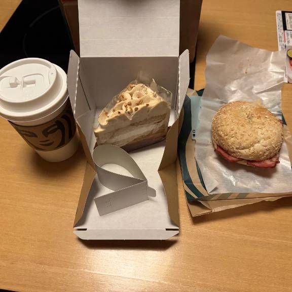 ついでにベーコンエッグチーズベーグルサンドとホワイトモカケーキ🍰も食べました😋